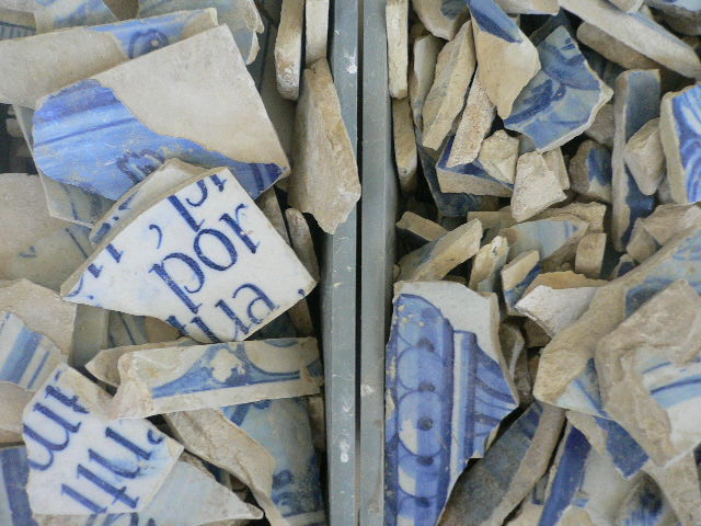 Ando à procura de motivos para pintar nas minhas novas peças. A ideia é que elas fiquem com um ar de que foram arrancadas e esculpidas de pedaços de uma parede onde existiram azulejos. Vou utilizar partes de desenhos que sejam facilmente reconhecíveis como pertencentes à azulejaria do séc. XVIII. O azul e branco ajuda, claro. Livros não faltam aqui na oficina e desenhos já picotados, que usei nas réplicas para intervenções de restauro, também não. E cacaria, nem se fala; temos pilhas de fragmentos que vão ficando de trabalhos e que guardamos religiosamente, nem sei bem para quê.