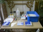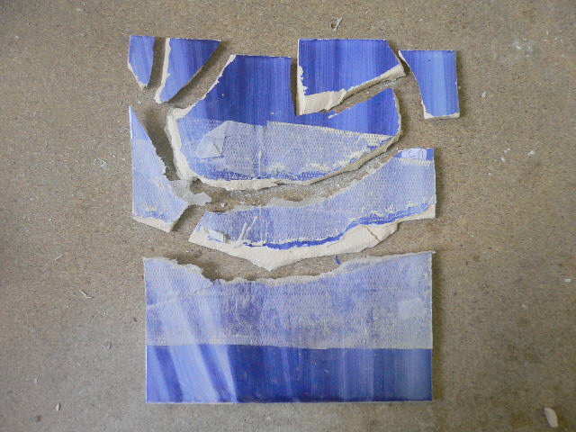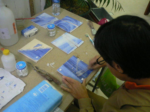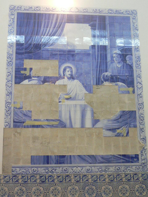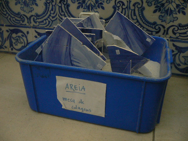 Acabámos o levantamento dos azulejos em risco de destacamento do painel da Igreja da Lousã. Todos os que ficaram estão aderentes (e bem!) à parede. Nalguns casos, os azulejos estavam apenas presos pelas juntas e soltaram-se mal estas foram abertas. Noutros casos, os azulejos estavam já fracturados ao meio, estando uma metade solta e a outra completamente presa com cimento cola, o que se revelou um problema para conseguir retirá-la, mesmo abrindo as juntas, tendo em conta que a espessura dos azulejos é mínima. Depois do exemplo de uma que retirámos toda partida, decidimos arriscar colar as outras mesmo na parede; apesar das colagens poderem não ficar perfeitas, é preferível a ter de restaurar inúmeras fracturas e pequenas falhas de vidrado que, por mais faceado que esteja, acabam sempre por se perder.