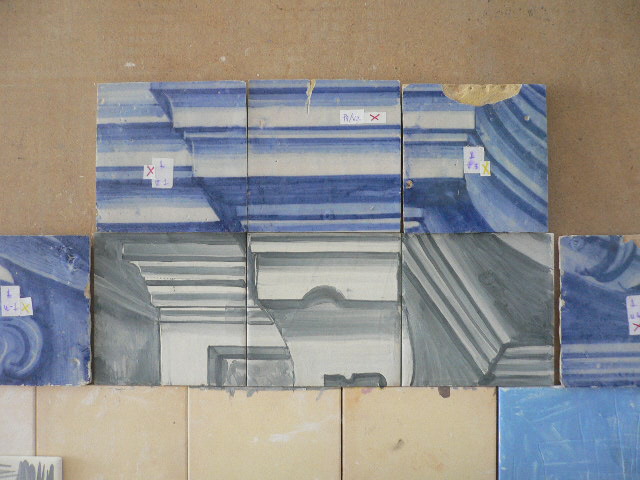 Hoje vi os resultados da fornada que fiz já com as réplicas dos azulejos pertencentes ao painel nº1 da Igreja da Misericórdia. O vidrado branco, como sempre, é o que dá mais nas vistas, mas dentro do conjunto, integram-se bem, até porque esta zona vai estar colocada num local bastante acima do nível dos olhos. Tenho este painel quase pronto, só me faltam os marmoreados, que, por terem muito branco e aguadas azuis muito claras, ainda me vão dar algum trabalhinho… E vou começar a montar os painéis 4 e 5, os próximos a intervir, para ir já olhando para eles e ver o que é que me espera.