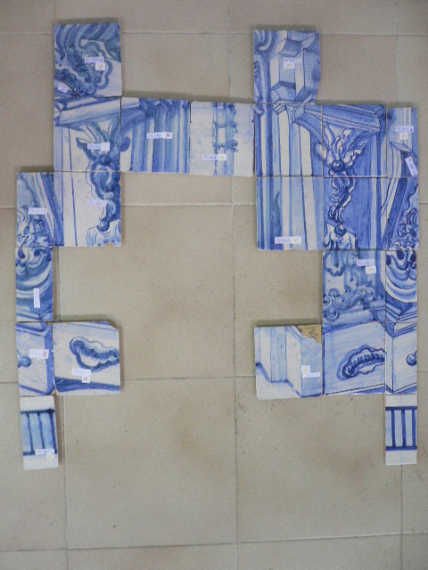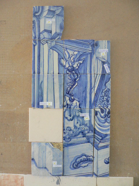 Acabei de acondicionar em caixotes os primeiros três painéis de azulejos com as réplicas terminadas; estão prontos, podem seguir para a parede. A In Situ defende que as réplicas se devem diferenciar dos azulejos originais, daí terem optado por utilizarem-se chacotas industriais em vez de manuais. O importante é que, a uma certa distância, se integrem bem no conjunto e ao perto se perceba que são réplicas; que foram feitas agora, durante esta intervenção de restauro e que não têm duzentos e tal anos. E eu concordo.