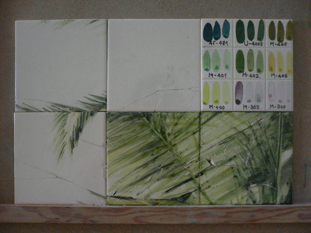 E agora, algo completamente diferente… para variar do azul e branco. Aproveitando a fornada que vou fazer dos azulejos de Tavira, cozo também umas experiências de cor para estas réplicas que uma colega me pediu para fazer. Ao que parece, são uns azulejos feitos especificamente pela Cerâmica Constância para uma casa-de-banho (há gostos para tudo, é o que vale!); não sei bem o que é que lhes aconteceu, mas estão todos fracturados e mal colados com uma cola de pedra, tudo desnivelado. Ela não os consegue descolar e achou melhor fazerem-se réplicas, até porque os preenchimentos a frio numa casa-de-banho, com humidade e limpezas regulares não haviam de durar muito… Pelos vistos, tenho alguma margem de diferenças de tons, o cliente já está avisado. Olarila!