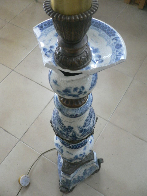 Mais uma coisinha pendente já há algum tempo aqui na oficina: um candeeiro de pé alto, todo em faiança, de umas pessoas amigas. Pelo que sei, levou um forte encontrão de uma criança brincalhona e caiu para o lado, partindo-se em vários pedaços. Como pesa bastante e tem um eixo interior em ferro, que agora está um bocado torto, a minha primeira impressão foi que, sózinha, não o conseguiria colar. No entanto, aqui há uns tempos e, com a ajuda do Loubet, lá conseguimos montar umas peças nas outras, um a agarrar por cima e o outro a agarrar por baixo. O mais difícil ficou feito e entretanto nunca mais lhe mexi. Vou aproveitar o balanço de tratar de assuntos pendentes e ver se de uma vez por todas o acabo de restaurar e o despacho de volta para a casinha dele ainda antes do ano novo…