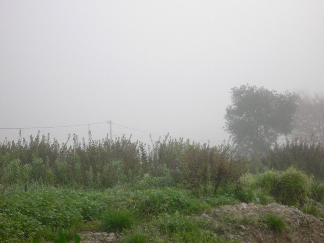 Finalmente! É bastante comum, no Inverno, a vista daqui da porta da oficina ter este aspecto, ou seja, não se ver um boi a três palmos de distância! Quando comecei este blog, ía a Primavera já bem adiantada, de modo que ainda não tinha tido oportunidade de registar este momento e, tirando a humidade por todo o lado, confesso que gosto! Supostamente, ali mais abaixo, atrás dos arbustos, fica a linha do combóio e mais abaixo ainda, costuma ver-se perfeitamente o Tejo e a Ponte Vasco da Gama… Assim sendo, volto para dentro rapidamente, acendo todas as luzes e ponho o cachecol para continuar os meus trabalhos de restauro…