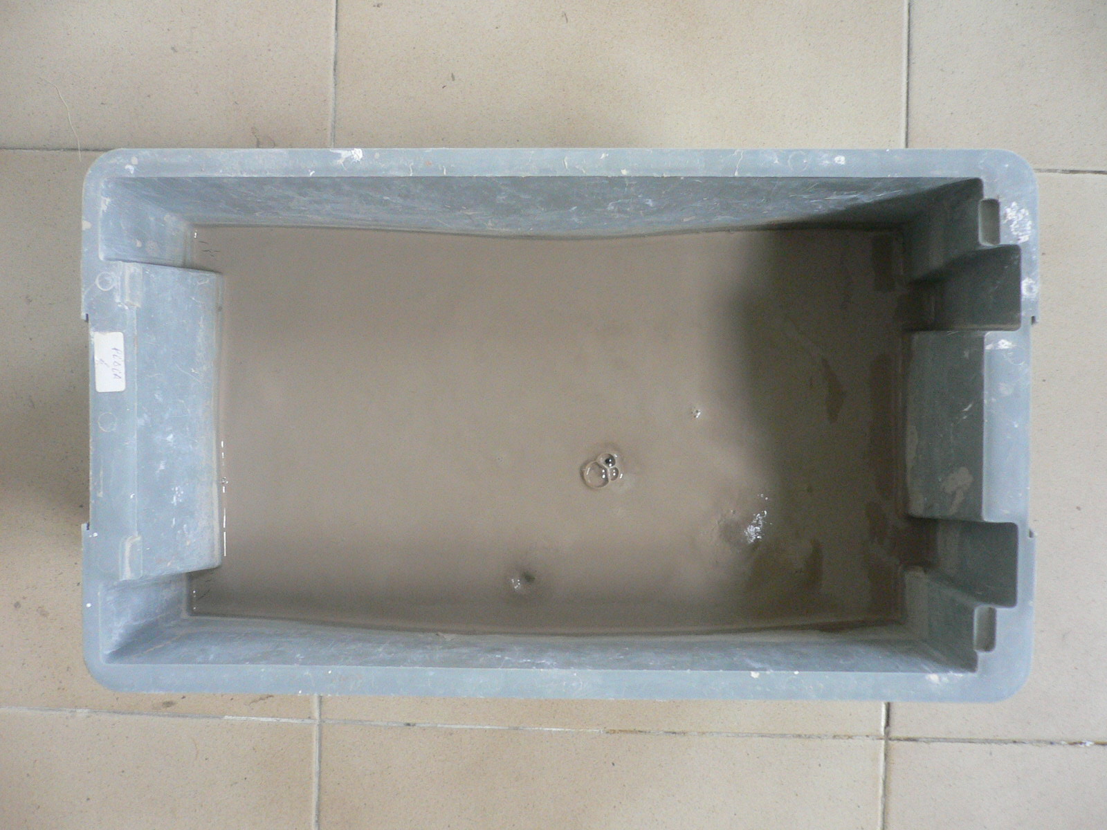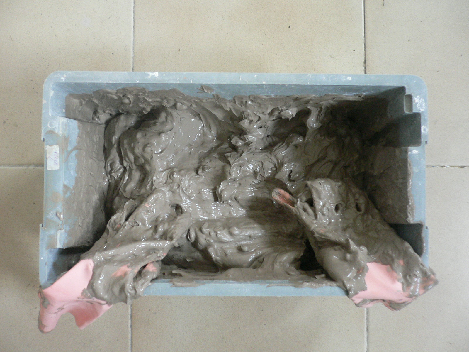 Hoje lá resolvi meter as mãos na massa, ou melhor, na lama. Com o frio que está aqui na oficina, foi precisa alguma coragem para fazê-lo e nem as luvas de borracha me ajudaram; aquilo estava gelado e doeram-me os ossos do braço inteiro, mas lá consegui ir amassando o melhor que pude, o que, pelo menos, sempre deu para aquecer um bocado. Não sei bem se a coisa está a resultar, ao fim de quatro dias dentro de água, pensei que os pedaços de barro seco já estivessem totalmente desfeitos, mas enganei-me e ainda encontrei bastantes grumos, o que não me parece bom sinal… Segundo o meu colega Ivo, o melhor é deixar ficar mais um tempo e depois tornar a amassar. Vou experimentar, a ver no que dá… (o que eu não daria para ter uma fieira! Mas pela maneira como estão as coisas, ainda vou ter muito que penar…)