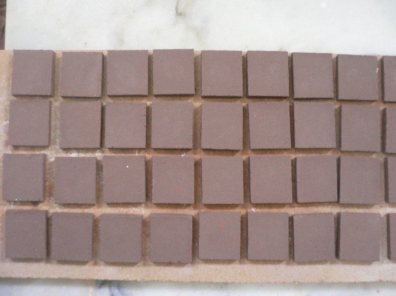 É sempre assim: há temporadas que ando para aqui a pensar o que é que hei-de fazer e os dias vão-se passando até que eu finalmente consigo encarrilar com algum processo produtivo. Quando isto acontece e eu meto a mão na massa, aparecem sempre inúmeras coisas para tratar, que me interrompem o trabalho e parece que não tenho tempo para nada. Retomei a minha produção cerâmica e quero fazer umas experiências com vidrados de alta temperatura, que nunca experimentei. Desta vez, para variar, fiz uma série de placas de experiências, com o barro refractário que costumo usar, para fazer receitas de vidrados. Normalmente experimento coisas novas logo com peças modeladas, sempre a pensar que se não correrem bem, «não há problema, é só uma experiência…», mas a verdade é que se correrem mal, fico sempre um pouco desapontada, pois uma peça cria sempre mais alguma expectativa do que uma mera placa de experiência. Para além de que poupo tempo. E material.