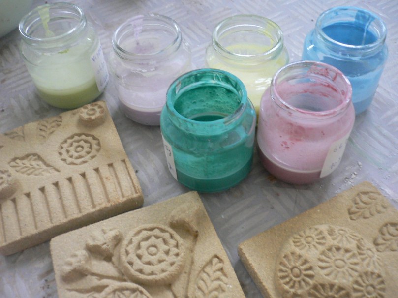 Acabei de vidrar as minhas placas de cerâmica relevadas da colecção «Pólen». Demorou mais do que imaginava, é um trabalho moroso e delicado que não dá para fazer à pressa e eu gosto de ser perfeitinha a trabalhar (olhó restauro…). Acabei de enforná-las, mais uma série de tacinhas pequenas, coloridas. Espero esta semana conseguir levar tudo à Original, o bom tempo vem aí e os turistas também. Lá na loja disseram-me que as cores chamam pessoas lá para dentro; eu cá não sei, não tenho experiência nenhuma, mas querem colorido? Então cá vai!