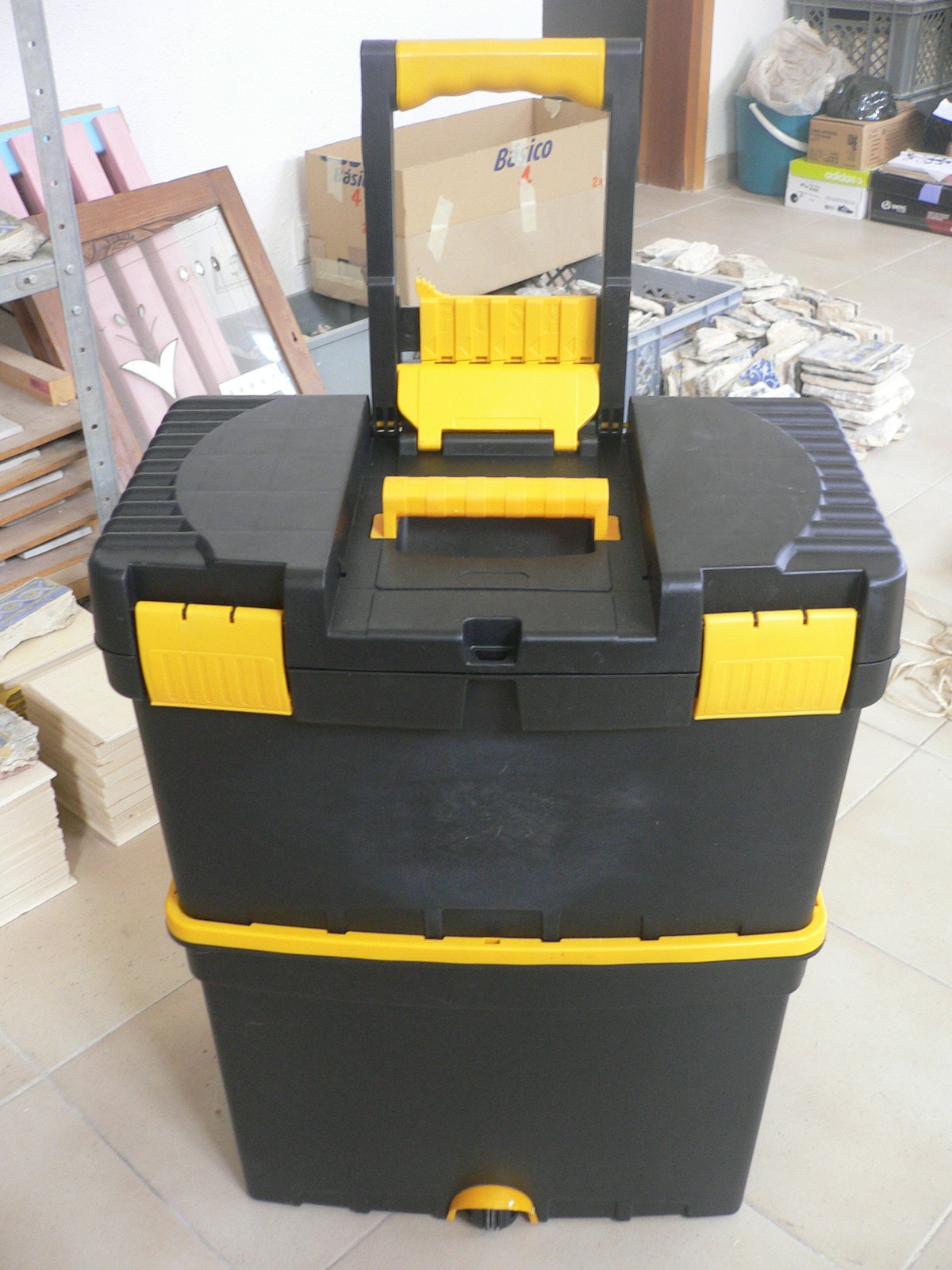 Comprei uma caixa de ferramentas nova. Tem dois andares, uma prateleira móvel e rodas para se poder transportar sem grande esforço. Não será o supra-sumo das caixas de ferramentas, qualquer outra de marca conhecida era duas ou três vezes mais cara, portanto, presumo que melhor; mas para já cumpre a sua função e espero que dure um bom tempo – pelo menos quatro meses, o prazo previsto para este trabalho. Já lá estão guardados os escopros, os martelos, o maço de borracha e as espátulas e também os frascos com Paraloid B72 já preparado e os da acetona e do álcool também. E ainda coisas várias como trinchas, óculos de protecção, extensões eléctricas, cabos de bisturi, escovas… Estou muito contente com esta nova aquisição; pormenores como este, tão simples e sem importância nenhuma deixam-me bastante satisfeita!