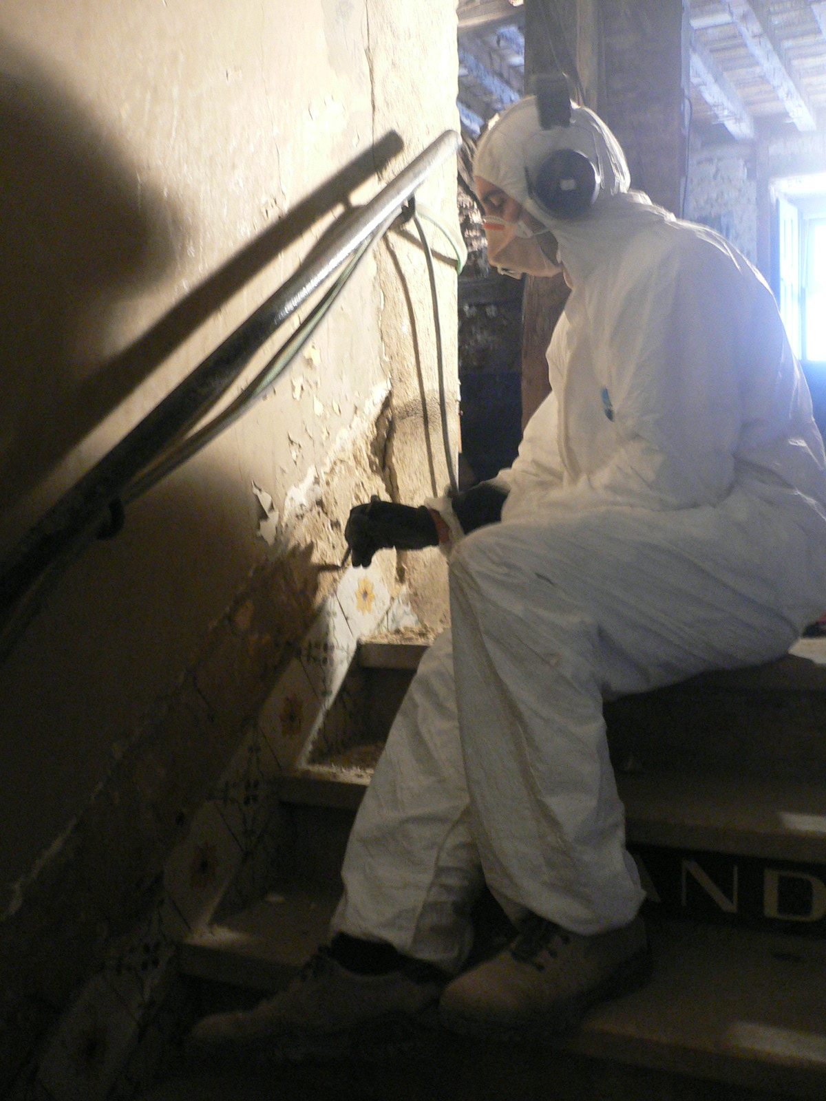 Iniciámos hoje a quarta semana de trabalho lá no 88. Estamos na recta final de levantamento de painéis da parede, embora para além disso ainda haja muito restauro para fazer. Aqui há uns dias comecei a tentar tirar os azulejos que restam no primeiro lance de escadas lá do prédio e nessa altura percebi porque é que não foram todos roubados – as argamassas de assentamento estão demasiado duras, o que até já era previsível pela quantidade de metades de azulejo deixadas na parede. A coisa não foi fácil; a posição não ajudava e em cada três azulejos lá se partia um, o que não sendo mau de todo, já me estava a irritar. Resolvi deixar essa tarefa para o colega Ivo, que tem muito mais paciência do que eu e menos dez aninhos de idade.