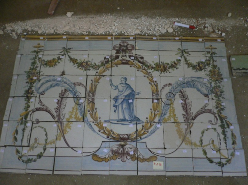 Continua a saga de remoção de tintas sobre as superfícies vidradas dos azulejos dos painéis do terceiro piso lá do 88; felizmente só por mais dois ou três dias – espero! Mas o esforço compensa e os resultados são mais do que satisfatórios, como se pode ver por este painel que encaixotámos ontem com a referência «03.02.14, Completo».
