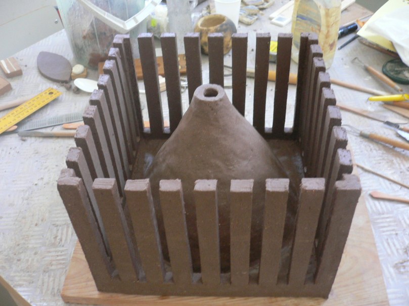 Lá segue a construção da minha peça em cerâmica para a exposição no Mosteiro de Alcobaça; já se vê qualquer coisa. A peça é um bocado complexa e tenho de estar atenta à secagem do barro: se por um lado tem de estar suficientemente seco para se poder trabalhar; por outro, tem de estar suficientemente húmido para se poder trabalhar… Tenho diferentes espessuras de paredes e todas têm de estar no mesmo ponto, para que não empenem nem partam. Enfim, um processo moroso; o que eu aliás já sabia, mas que nesta altura do campeonato não dá jeito nenhum. Se quero ser seleccionada, tenho de entregar até ao fim de Junho toda a documentação relativa à peça, incluindo 3 imagens: título e dimensões da obra; peso; materiais e técnica de realização; autor e memória conceptual e justificativa. Posso dizer que nesta altura já tenho um terço de todo o trabalho feito, mas ainda tenho muito pela frente!
