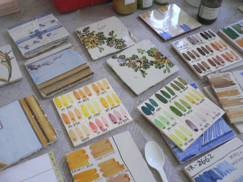 Comecei a trabalhar nas réplicas para integrarem o conjunto azulejar do 88. Como sempre, há pressa na entrega das mesmas, apesar de se lhes explicar que isto não se faz de um dia para o outro. Por acaso consegui comprar chacotas manuais, o que foi uma sorte, pois nem sempre há em stock o número suficiente que se precisa e já vai adiantar o processo. Agora, o costume; fazer experiências de cores, retirar desenhos, vidrar, limpar vidrados, picotar… Felizmente já tenho muitas cores onde me basear e é só fazer alguns acertos, mas entre enfornar e desenfornar, passa um dia.