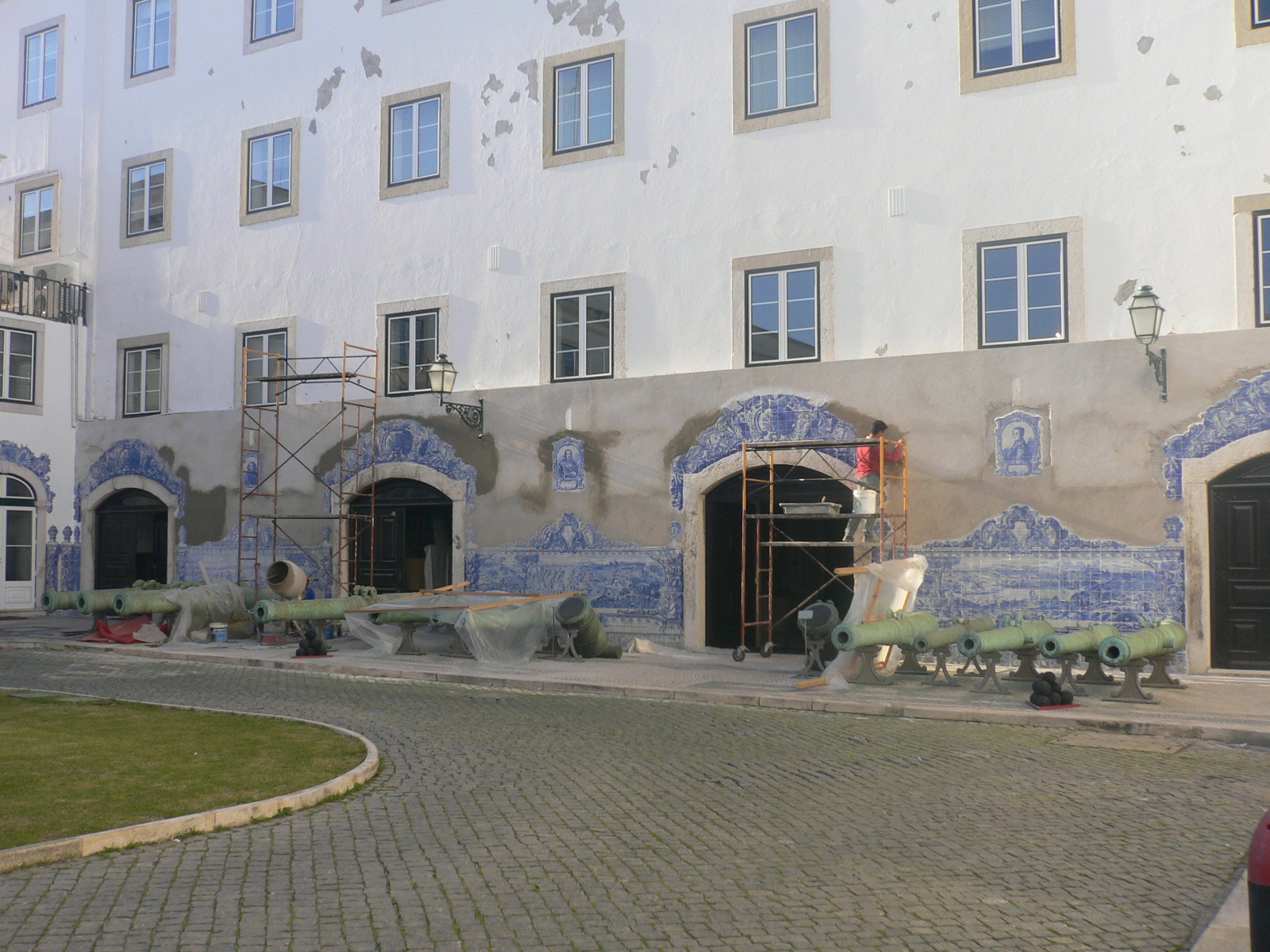 Estão de volta à parede todos os painéis de azulejos da fachada Norte, incluindo o Ni-2, que esteve quase cinco semanas em dessalinização e todas as réplicas que foram necessárias fazer. A vista geral do pátio é já muito diferente e nesta fase, com todos os azulejos limpos, juntas fechadas e praticamente todos os preenchimentos feitos, quase parece que o trabalho está terminado – apesar da descoberta de mais um tubo de água todo rachado e com falta de alguns bocados no interior da parede da fachada Este, o que obrigou ao levantamento de não sei mais quantos azulejos que já estavam quase dados por terminados. Mas tudo bem, estou satisfeita com esta intervenção e ao que parece, até à data, o Estado Maior do Exército também.