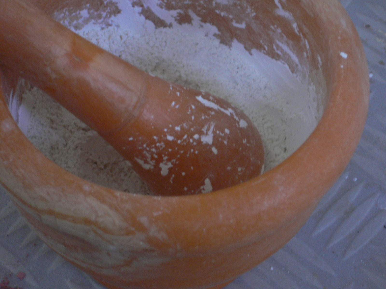 Como estou lançada nisto de fazer experiências de brancos, resolvi pegar nas amostras escolhidas e, a partir dessas, já me ocorreram mais não sei quantas receitas que posso experimentar – podia ficar assim o resto da vida; as hipóteses desmultiplicam-se a olhos vistos. Vou partir de um vidrado base que temos aqui na oficina, que nunca usamos e que agora se revelou ser o mais adequado para estas réplicas. O saco estava guardado há que tempos e o pó apanhou alguma humidade, havendo alguns torrões que têm de ser desfeitos no almofariz. É uma tarefa um pouco morosa, mas fico com a impressão de ser uma ceramista a sério, parecida com os senhores que vêm nas imagens dos livros de cerâmica que temos aqui na oficina.
