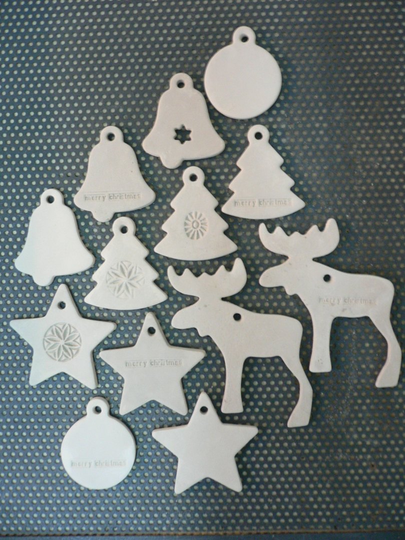 As peças em barro refractário já foram a cozer a noite passada e agora trato dos acabamentos nas de faiança – trabalho de sapa, lixar uma série de pecinhas pequenas, mas os acabamentos, toda a gente sabe, são morosos mas fazem a diferença e eu nestas coisas gosto de ser perfeitinha. Estas pensei-as para pendurar; na árvore de Natal, na porta da entrada, onde se quiser; só ainda não sei bem como é que hão-de ser decoradas, mas já tenho uma série de ideias. Mas primeiro tenho de acabar esta fase; se tudo correr bem, amanhã conto encher o forno grande para enchacotá-las – a estas e às mais não sei quantas que tenho já prontas aqui na oficina.
