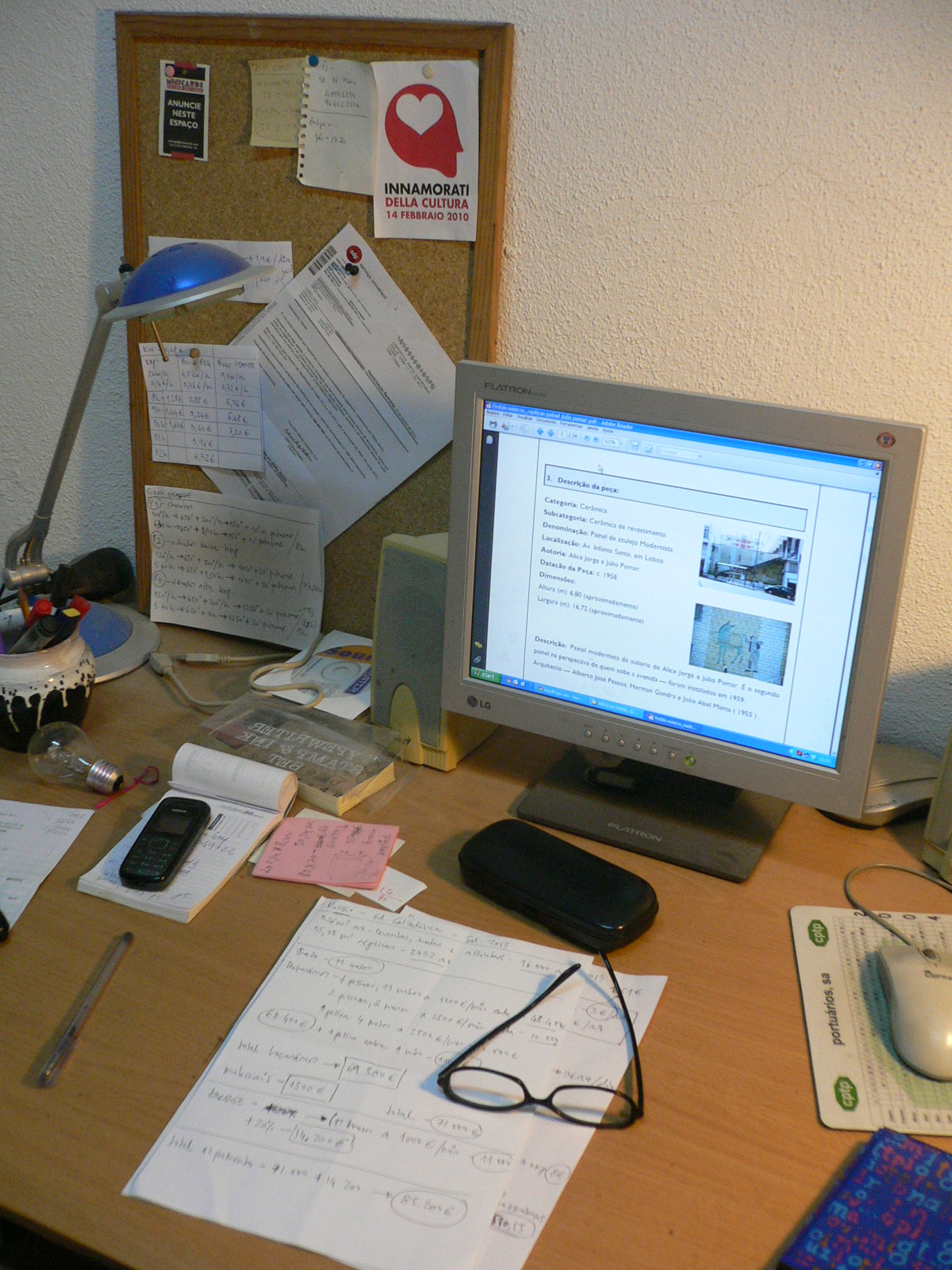 Não sei o que é que se passou agora, mas desde que começou Setembro, as coisas começaram a mudar, a mexer. De repente tive três pedidos de orçamentos para fazer, tanto de conservação e restauro de azulejos como de manufactura de réplicas; dos quais dois foram daqueles para entregar quase no dia seguinte, cheios de cálculos e coisas para pensar – trabalhos para alguns meses, com uma grande equipa. De modo que nestes últimos dias tenho andado às voltas com a papelada, as contas e o nó na barriga.