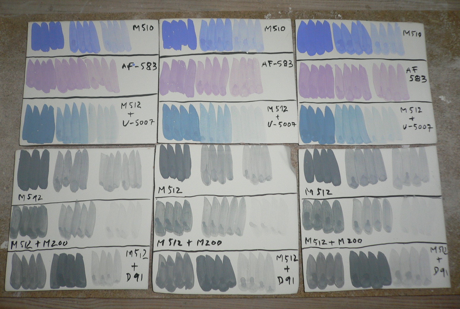 Comecei hoje mais uma nova encomenda, desta vez cerca de vinte e cinco réplicas de azulejos do séc XVIII – coisa pouca, mas melhor do que nada. Para já, experiências de cor; vidrados base e tintas de alto fogo: três brancos diferentes e seis tipos de azul. Amanhã vão a cozer a 1000º e se nenhum servir, tenho de fazer tudo de novo.