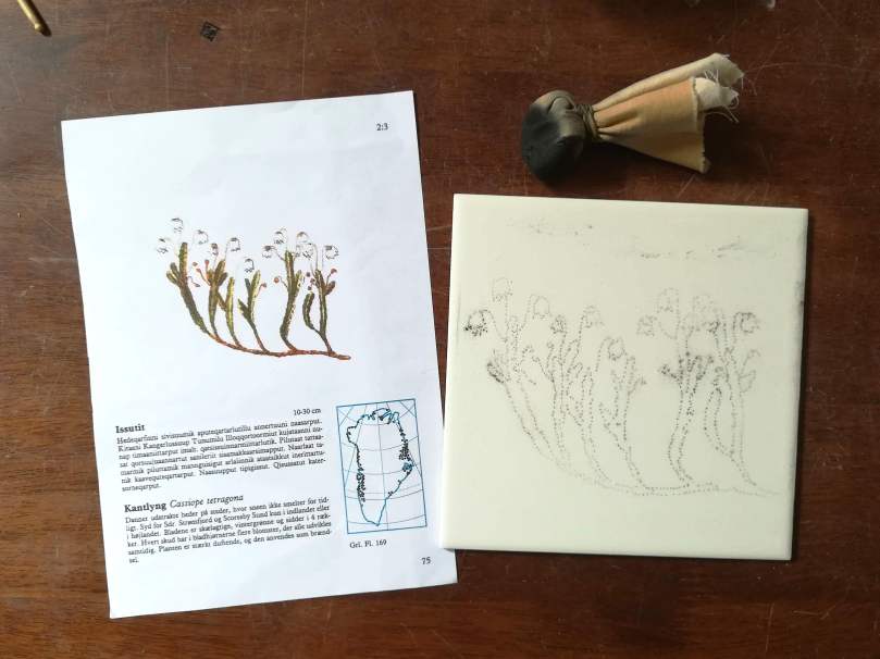 Foram 18 ilustrações botânicas diferentes, com representações científicas de plantas do Ártico, bastante detalhadas e minuciosas; as quais reproduzi manualmente, uma a uma, sobre o vidrado crú, com o rigor e a obsessão de quem teve formação e trabalhou em restauro durante 20 anos e que agora ganha a vida a fazer réplicas de azulejos quase miméticas – uma trabalheira, portanto; muito maior do que aquela que avaliei ao princípio, quando julguei que era apenas para pintar flores.