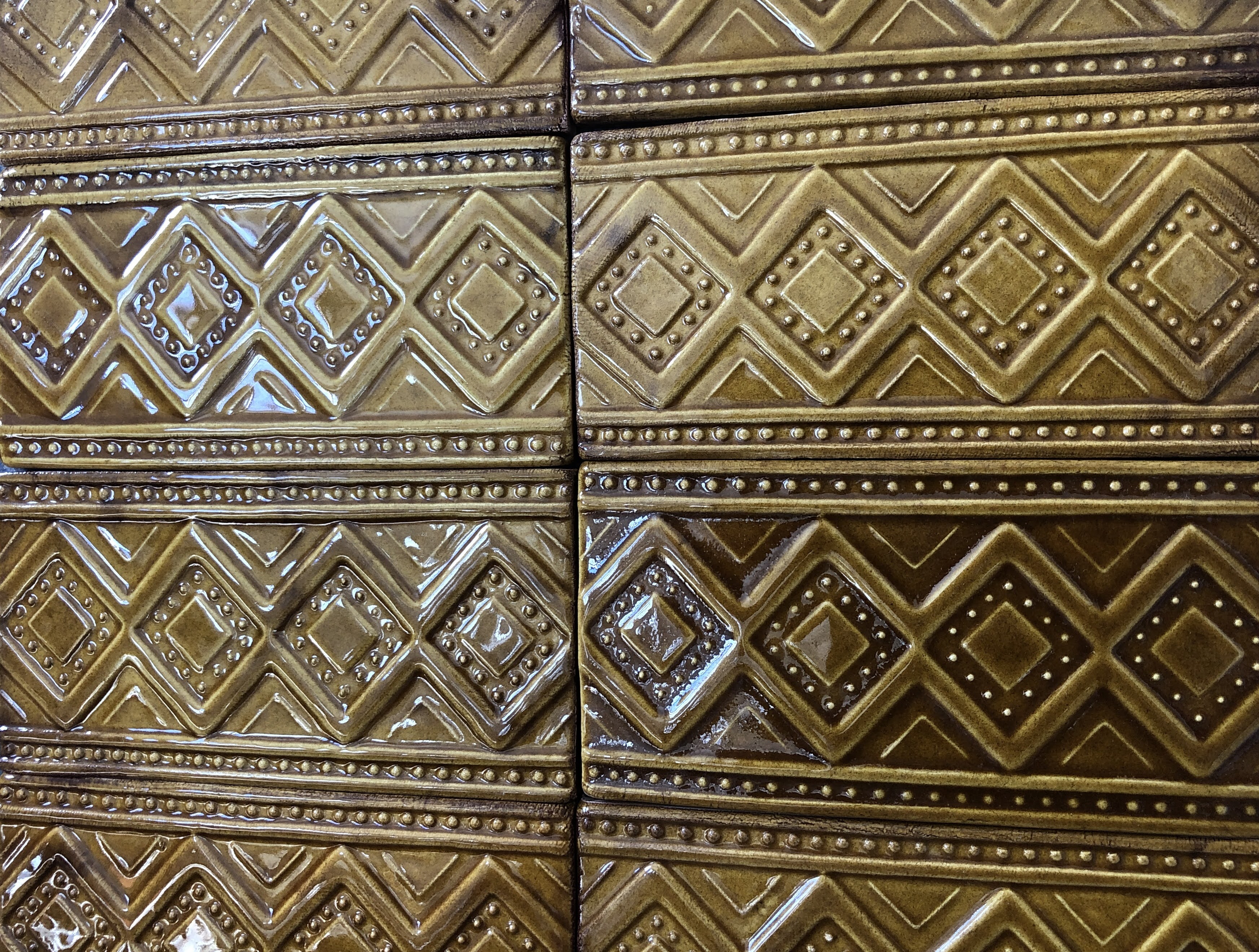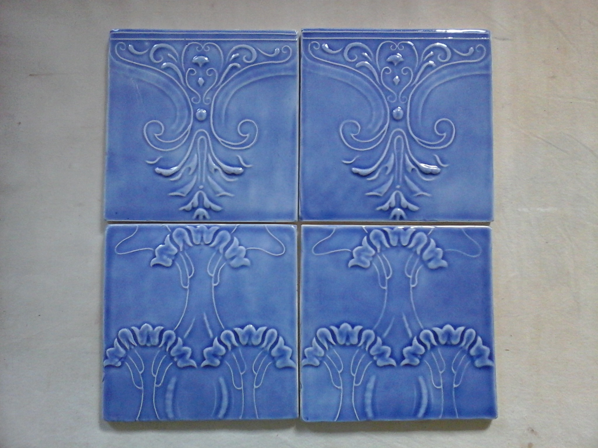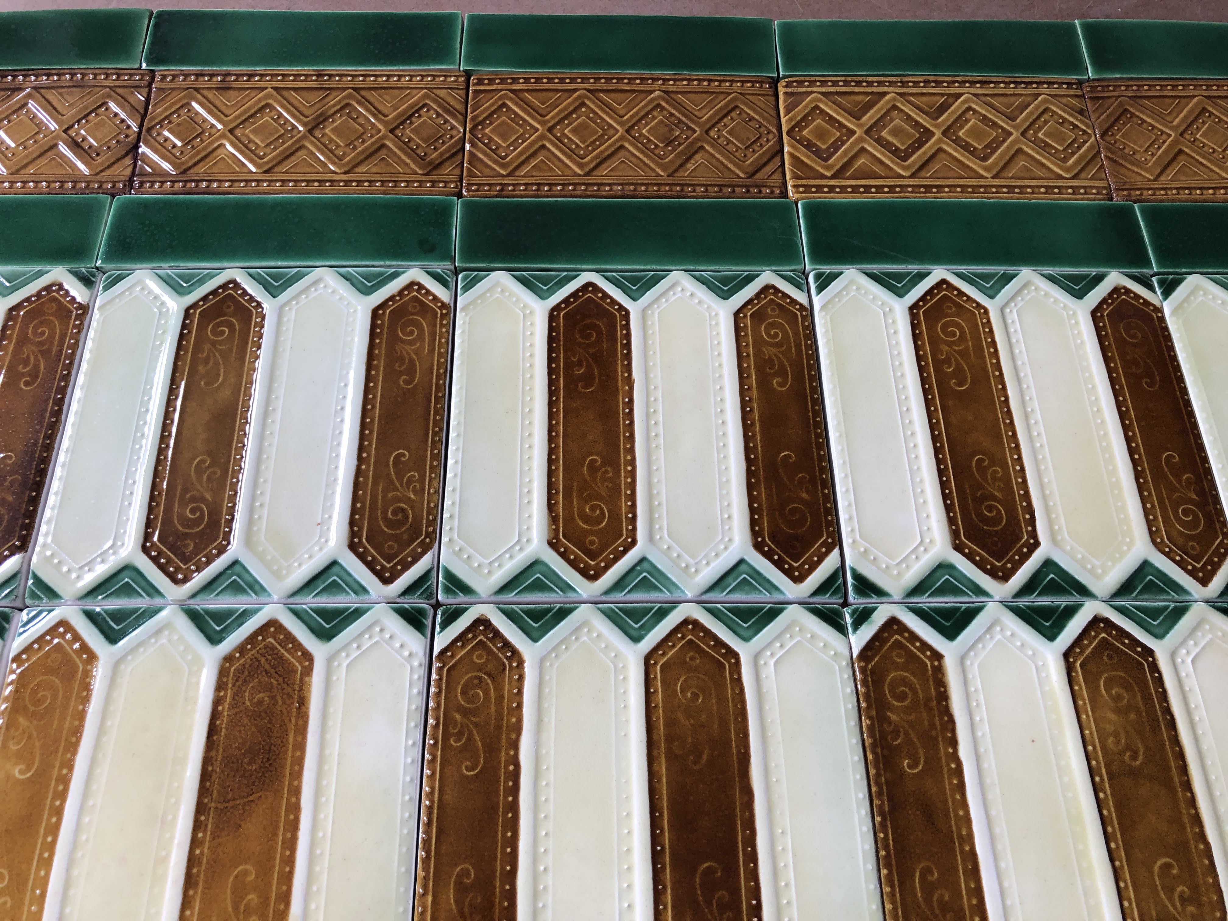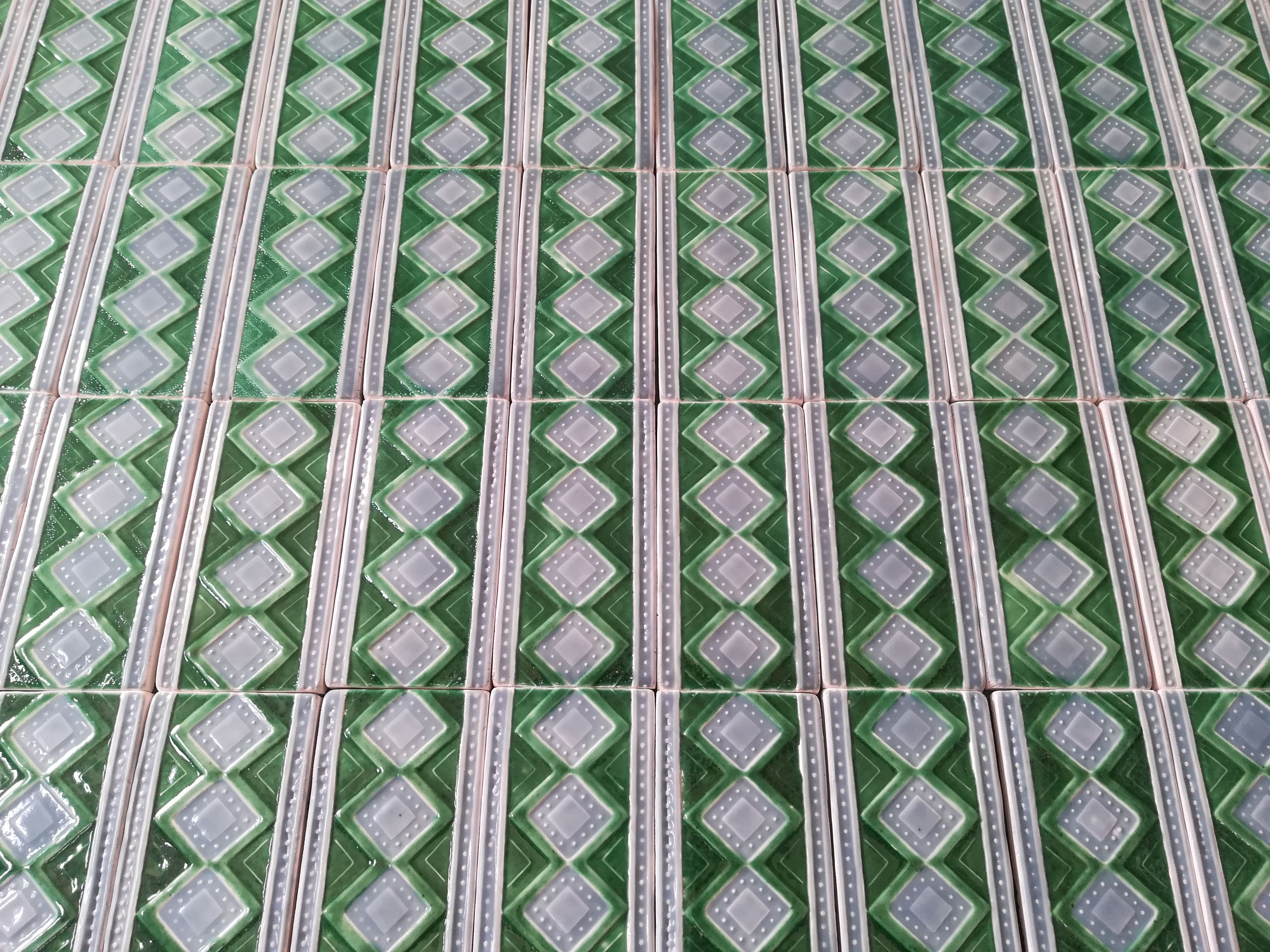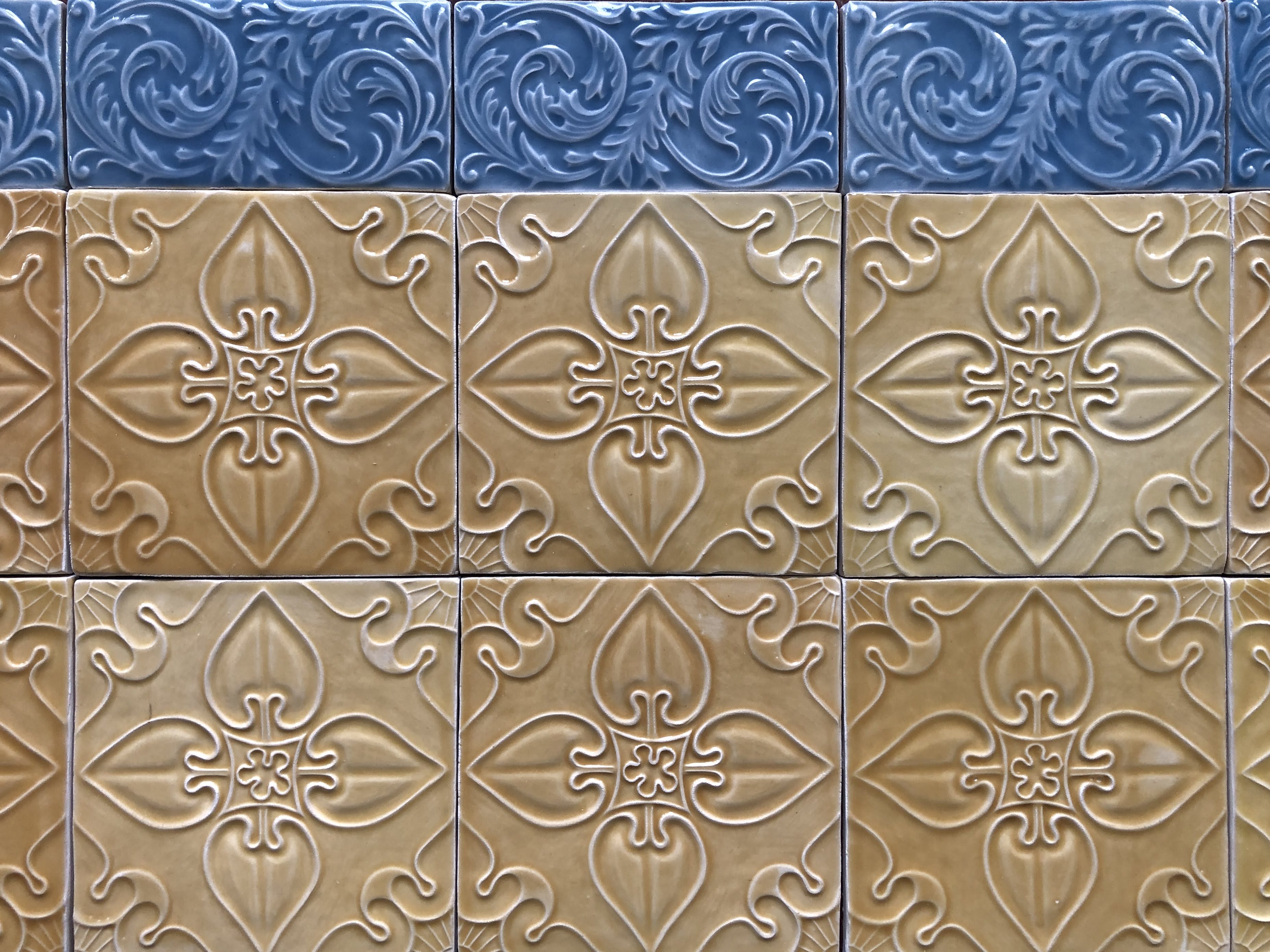 Réplicas de azulejos e frisos em meio-relevo da antiga Fábrica de Sacavém, produzidas manualmente para fachadas e interiores de edifícios.