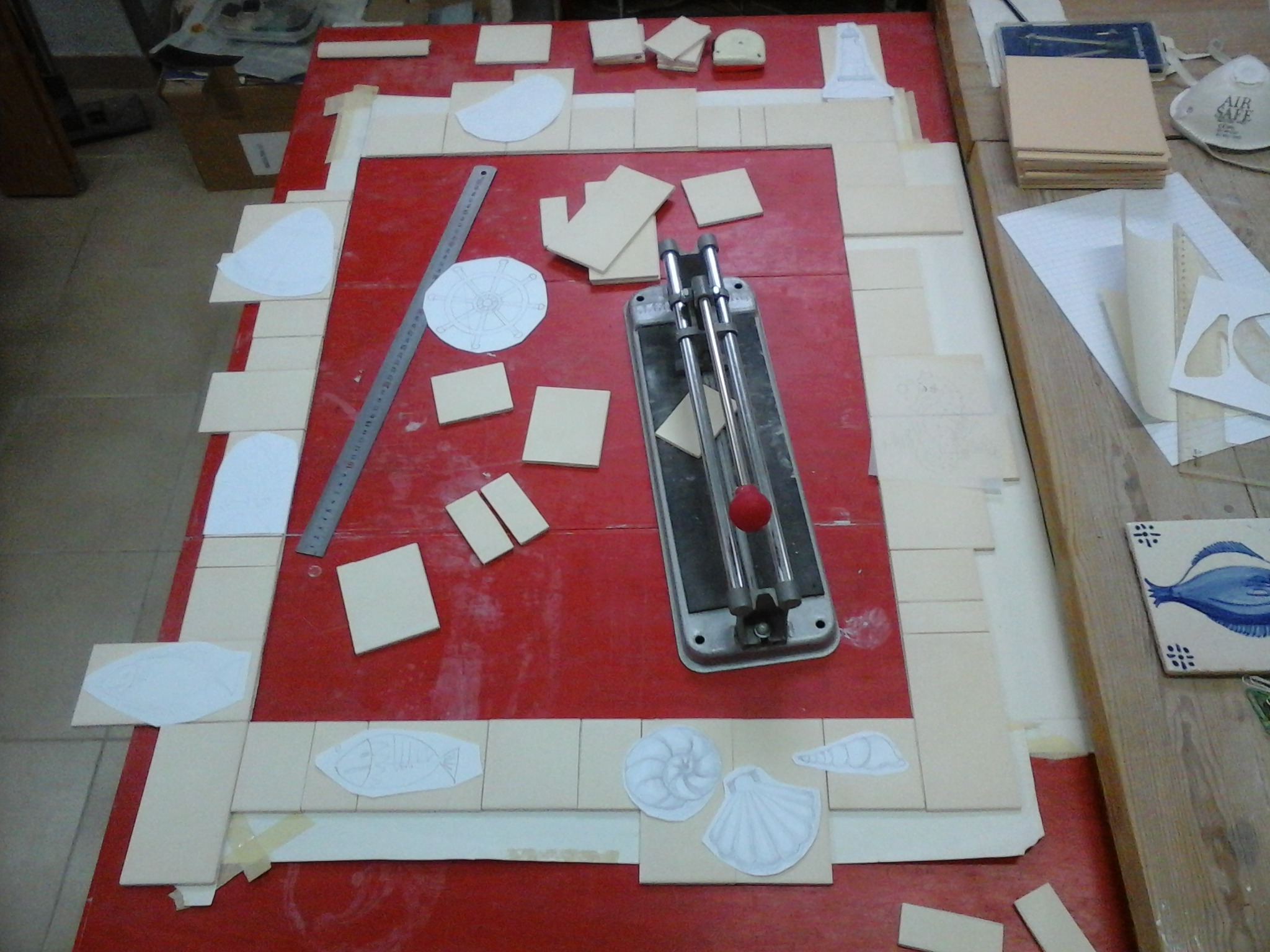 Trata-se de uma moldura em azulejos para um espelho com 70x55cm, para um balneário de piscina e as indicações que tive foram apenas para que fosse a azul e branco, com motivos marinhos e com pontas assimétricas – assim como eu quisesse, que ficava ao meu critério, “a artista és tu”.