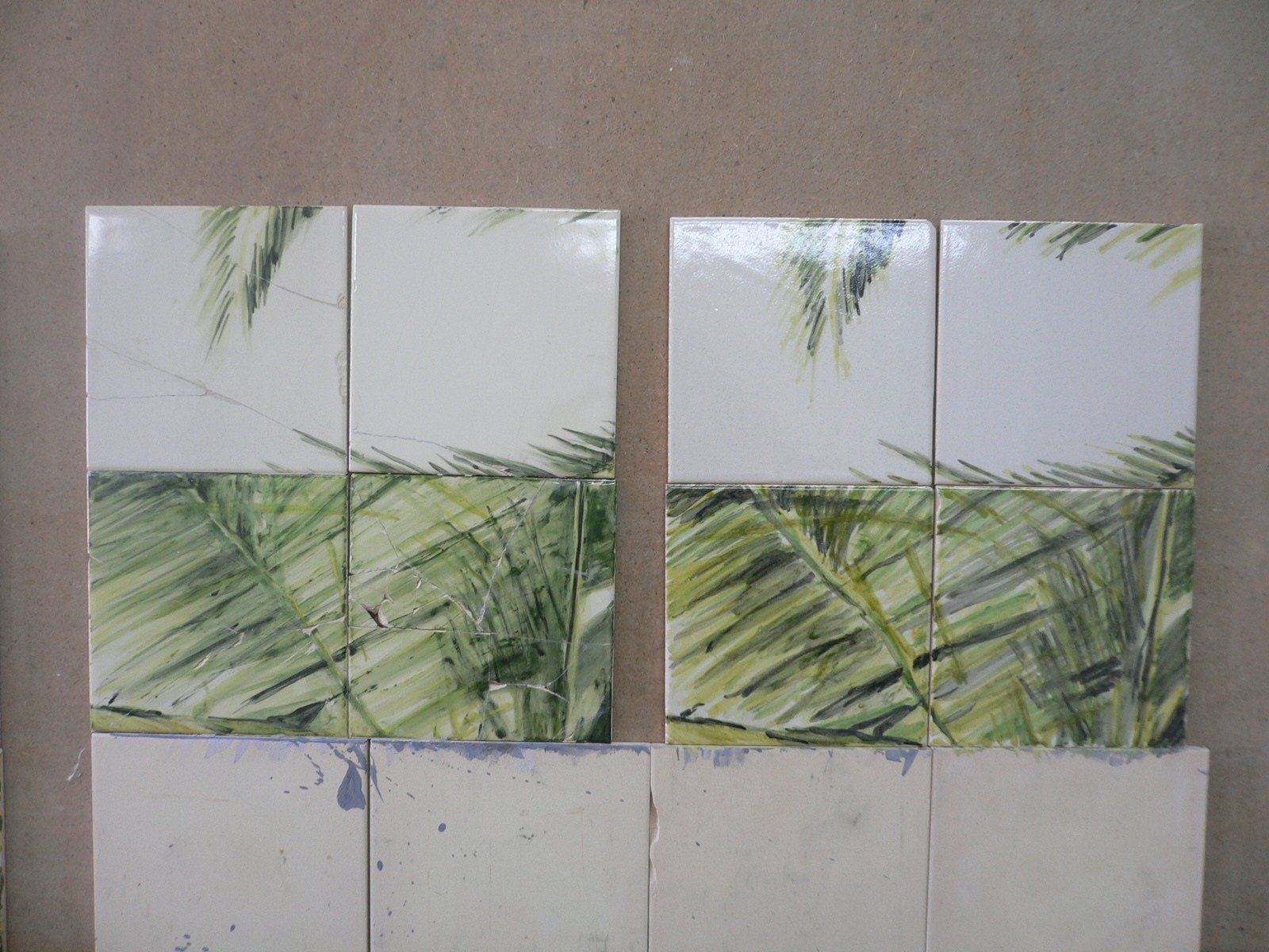 Hoje, quando estava a montar no chão o painel 16 para fazer as réplicas necessárias, tive esta surpresa: azulejos verdes e brancos! Tratei de ir logo abrir o documento que a Rita me enviou com as fotografias deste painel na parede e então, é mesmo verdade e inédito, pelo menos para mim; no meio do conjunto azul e branco, existem uns quantos verdes! Nunca tal tinha visto. Não são azulejos originais, claro; apesar de manuais e muito bem feitas, a pasta destas chacotas é bastante diferente e vê-se a olho nu. Agora, quando é que foram feitos e porque é que são a verde e branco, é que não consigo explicar… O Loubet, que entretanto passou por cá de fugida e tratou logo de perguntar «que é isto!?», avançou com a teoria da ética do restauro, ou seja, pode-se e deve-se diferenciar as réplicas dos originais. E ando eu aqui sempre aflita a tentar aproximar os tons o mais possível…