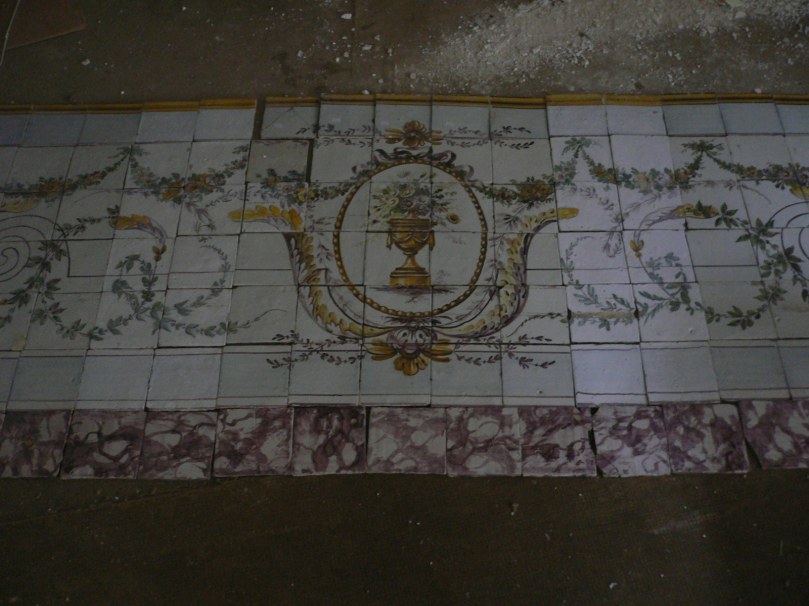 No 88… as réplicas estão feitas; os painéis estão todos de volta às paredes; as juntas todas betumadas; as escadas prontas com azulejos «inventados» dos que sobraram – visto que os dali tinham sido roubados quase na sua totalidade; os rodapés colocados e recolocados inúmeras vezes, os azulejos limpos e relimpos e relimpos e re…; os preenchimentos feitos e pintados, apesar de toda a poeirada e porcaria que já devem ter em cima. O que é que falta ainda? Na verdade, pouco; muito pouco, quatro ou cinco painéis do primeiro piso que ainda estão por preencher e pintar e uma tranche que supostamente teria de ser paga nesta altura – após o assentamento – e que teima em não vir, apesar de ter sido aceite nas minhas condições de pagamento.