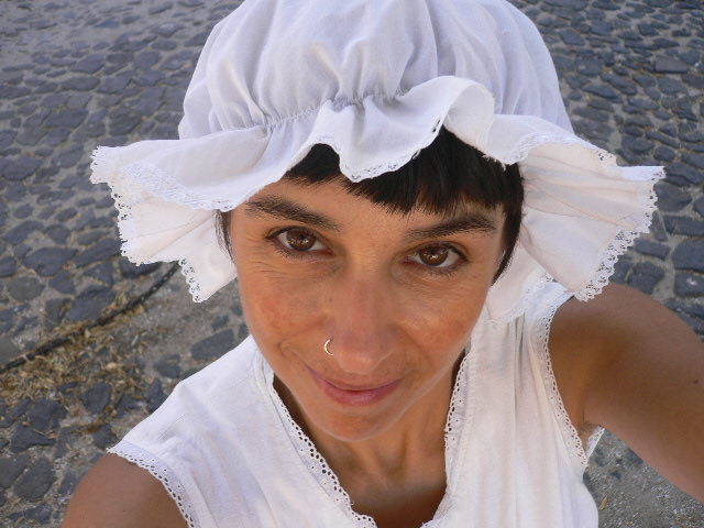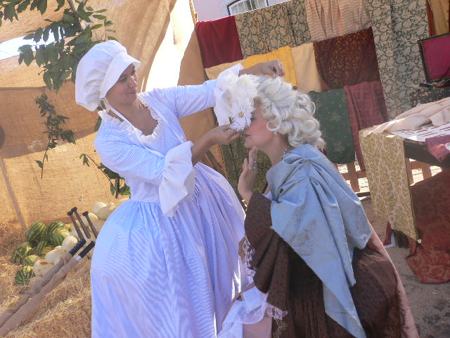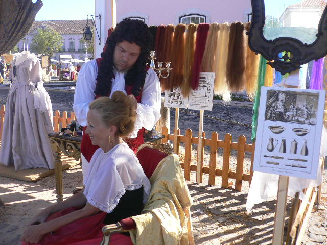 Já está! Muito gira, esta feira! Gostei. Bem organizada, com bancas com produtos diferentes, seleccionados à época (embora haja sempre uns desvios, claro, mas não muitos…) e animação histórica bem feita e engraçada. A organização teve o cuidado de fornecer roupa aos comerciantes e artesãos, de modo que tudo estava bem unificado. A mim trataram de me dar uma touca, mais setecentista, uma vez que a outra que eu tinha era demasiado medieval.