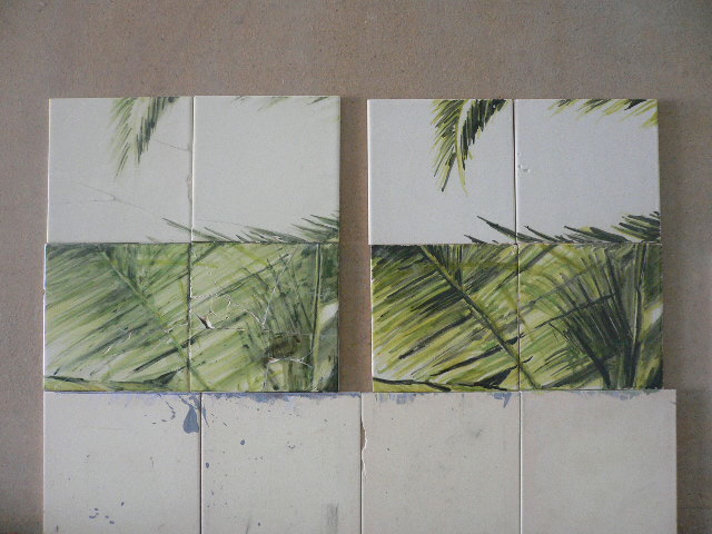 Acabei agora de pintar as réplicas que ainda me faltavam do painel 1 e ainda todas as dos painéis 4 e 5, que não eram muitas. Combinei entregar o máximo que conseguisse na próxima sexta-feira, para o trabalho poder avançar lá na igreja e para isso tenho de cozê-las esta noite, de modo a rentabilizar o bi-horário e poder abrir o forno calmamente na sexta de manhã, quando já estiver frio. É pena esta fornada ir a meio-gás, ainda me faltam fazer mais três painéis; mas para esta leva já não tenho tempo (nem espaço!), para montar mais nenhum no chão e repetir todo o processo de tirar desenhos, picotar e voltar a pintar. Por isso… paciência, vai assim mesmo.