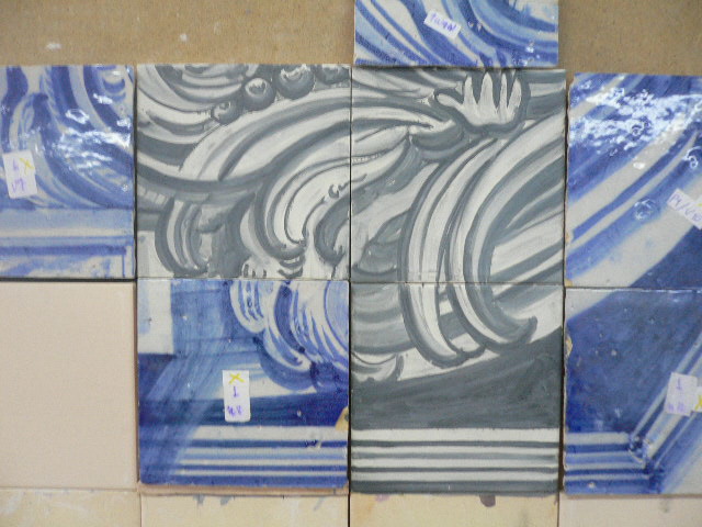 Hoje vi os resultados da fornada que fiz já com as réplicas dos azulejos pertencentes ao painel nº1 da Igreja da Misericórdia. O vidrado branco, como sempre, é o que dá mais nas vistas, mas dentro do conjunto, integram-se bem, até porque esta zona vai estar colocada num local bastante acima do nível dos olhos. Tenho este painel quase pronto, só me faltam os marmoreados, que, por terem muito branco e aguadas azuis muito claras, ainda me vão dar algum trabalhinho… E vou começar a montar os painéis 4 e 5, os próximos a intervir, para ir já olhando para eles e ver o que é que me espera.