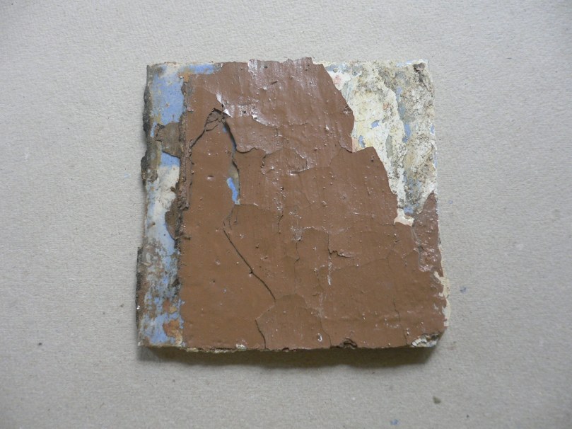Apesar de ser domingo, só hoje tive tempo para fazer o balanço da semana de trabalho que passou lá no 88. Aproveitando o facto de o Loubet e o Ivo estarem no Pinhão, esta semana serviu sobretudo para tratar e organizar tudo o que já estava levantado, antes de começarem a chegar mais azulejos e instalar-se a confusão total: limpeza de argamassas, limpeza de vidrados, limpeza de fracturas, colagens de fragmentos e montagem final de painéis no chão, com reorganização dos azulejos em falta, reorganização de azulejos de cercadura e rodapé e substituição de casos em muito mau estado de conservação por outros idênticos retirados dos painéis que não vão voltar para a parede. Para não falar na tarefa mais morosa da semana, que nesta fase já vai também bastante adiantada – remoção de tintas sobre as superfícies vidradas, tanto em painéis ainda nas paredes do 3º piso, como em azulejos soltos; com aplicação de duas ou mais camadas de decapante de forte cheiro.