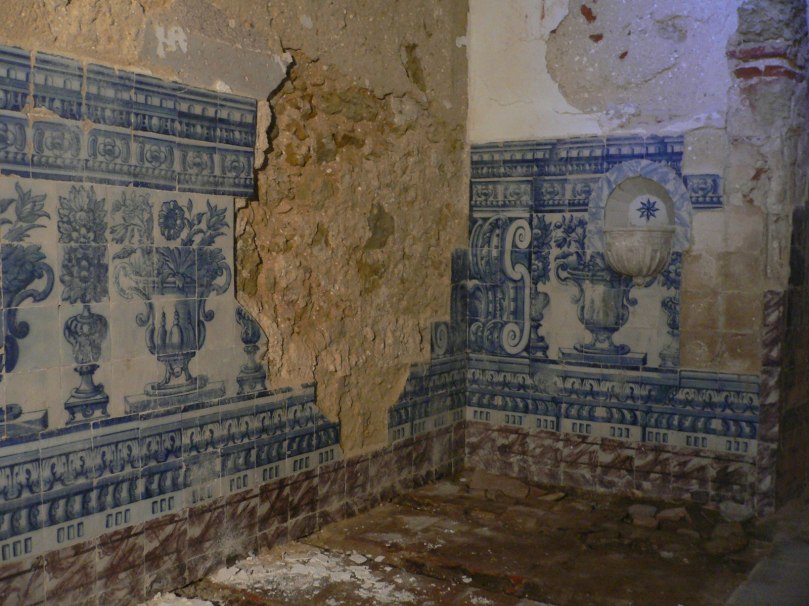 Em 2002 eu e o Loubet fomos contactados pela delegação do IGESPAR de Évora para irmos fazer um trabalho na Capela do Senhor dos Aflitos, dentro do castelo de Campo Maior. Tratava-se de levantar da parede sete ou oito silhares de azulejos, de origem desconhecida e completamente trocados. Depois do levantamento, trouxemos os azulejos aqui para a oficina, removemos as argamassas dos tardozes, consolidámos falhas de vidrado e colámos fracturas e depois, com grande paciência, organizámos os puzzles, ainda conseguindo formar uma série de desenhos, apesar de terem ficado soltos uma série de azulejos com caras de anjos, concheados e bases de colunas, que não entravam em lado nenhum. O que nos tinha sido proposto, nessa fase, estava terminado e guardámos os azulejos em caixas devidamente identificadas por painéis e motivos soltos.